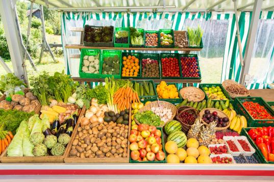 Der Marktstand zeigt verschiedene Früchte und Gemüse. Die meisten dieser Produkte sind auf die Bestäubung durch Bienen angewiesen. Gesunde Bienenvölker sind von ökologischer und ökonomischer Bedeutung. Es besteht ein dringender Bedarf, bienenschädliche Pestizide aus der Landwirtschaft zu eliminieren.