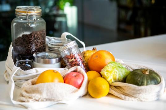 Lebensmittel, einschließlich frischer Lebensmittel und Grundnahrungsmittel, die online bestellt werden, mit wiederverwendbaren Baumwollnetzbeuteln und Gläsern für die Lieferung.