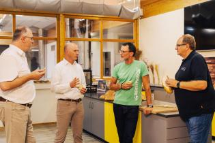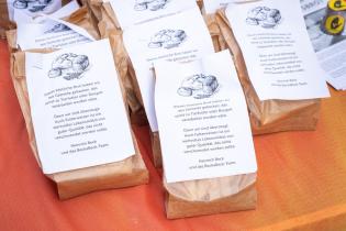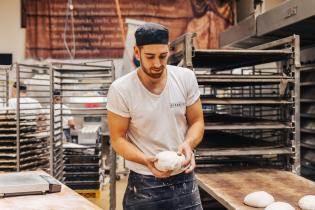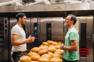 Beck stellt sich bei der Teigzubereitung jeweils auf das Mehl ein, das je nach Ernte und Sorte zum Beispiel unterschiedliche Mengen an Wasser aufnimmt und unterschiedlich lang und stark geknetet werden muss. Genau so verfährt er auch mit unserem Mehl aus Futterweizen und setzt einen Vorteig an, der über Nacht ruht, bevor der eigentliche Teig hergestellt wird. “Auch Futterweizen ist ein wertvolles Lebensmittel von guter Qualität, das nicht verschwendet werden sollte”, ist Beck überzeugt. Trotzdem steigt die Spannung, als die geformten Brotlaibe in den Ofen geschoben werden. Nach einer Stunde werden sie mit großen Schiebern schließlich herausgeholt. Das Urteil von Lambrecht nach dem Probieren: “Schmeckt gut!”