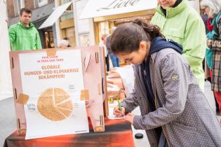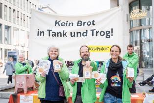 Einige Monate zuvor: Nach dem Angriff Russlands auf die Ukraine fielen die üblichen Getreidelieferungen zunächst komplett weg, bevor sie irgendwann wieder vereinzelt möglich wurden. Diese Verknappung macht das Essen für Menschen teurer und trägt dazu bei, dass in vielen Ländern immer mehr Menschen hungern. Und in Deutschland? Die landwirtschaftliche Fläche hier ist begrenzt. Umso erstaunlicher, dass knapp zwei Drittel der 16,6 Millionen Hektar dafür genutzt werden, Schweine, Kühe und Hühner zu ernähren und Rohstoffe für Biokraftstoff anzubauen. Das verschärft die Ernährungslage nochmal. Würde die Bundesregierung die Beimischung von Biosprit aus Getreide und Speiseöl zu Benzin und Diesel stoppen, wäre dies ein erster entscheidender Schritt. Doch in der öffentlichen Debatte um Essen, Tank oder Trog wird immer wieder behauptet, dass der Weizen, der an Tiere verfüttert oder zu Biosprit verarbeitet wird, nicht backfähig und daher nicht für die Lebensmittelproduktion geeignet sei Angesichts dieser kritischen Situation fasst Greenpeace einen Plan: Wir wollen zeigen, dass auch ein Großteil des Weizens, der bislang an Tiere verfüttert oder zu Biosprit verarbeitet wird, ein wertvolles Lebensmittel ist, das im Kampf gegen den Hunger zur Verfügung stehen könnte.