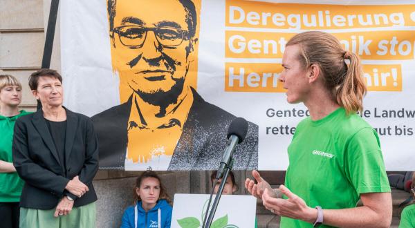 Damit Lebensmittel-, Saatgutproduzierende sowie Verbraucher:innen künftig noch die Wahl haben, gentechnikfreie Produkte zu wählen, zogen Aktivist:innen heute vor das Bundeslandwirtschaftsministerium in Berlin. Greenpeace und anderen Umwelt- und Bäuer:innenverbände forderten Bundeslandwirtschaftsminister Cem Özdemir (Grüne) auf, sich für eine weitere Regulierung einsetzen.
