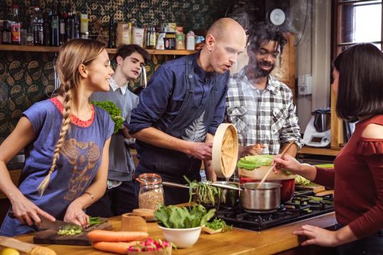 Junge Erwachsene bereiten gemeinsam vegetarische Gerichte zu.