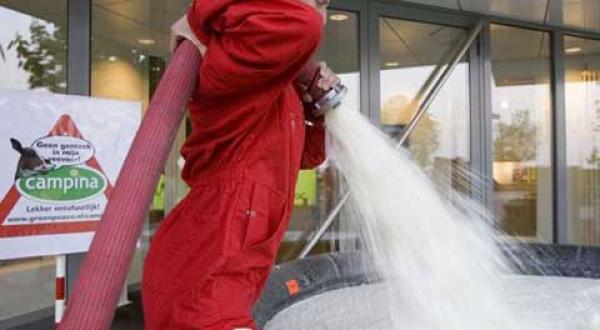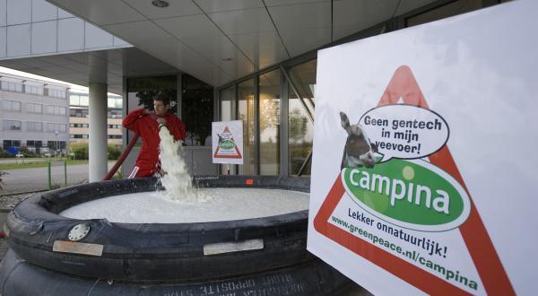 Greenpeace-Aktivisten haben der Molkerei Campina am Donnerstag 2000 Liter Milch zurückgebracht. Mit einer Riesen-Wanne Milch vor dem Eingang der niederländischen Zentrale Konzerns in Zaltbommel protestiert Greenpeace gegen die Verfütterung von Gen-Pflanzen bei der Milchproduktion. Trotz seines naturnahen Images, das Campina in Deutschland mit der Marke Landliebe teuer verkauft, weigert sich Campina bislang standhaft, seine Vertragsbauern auf gentechnikfreie Fütterung zu verpflichten.