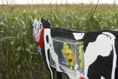 Aktivist mit Schild "Vorsicht Gen-Milch von Müller" und Aufsteller einer Weihenstephan-Kuh auf Gen-Maisfeld.