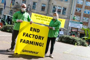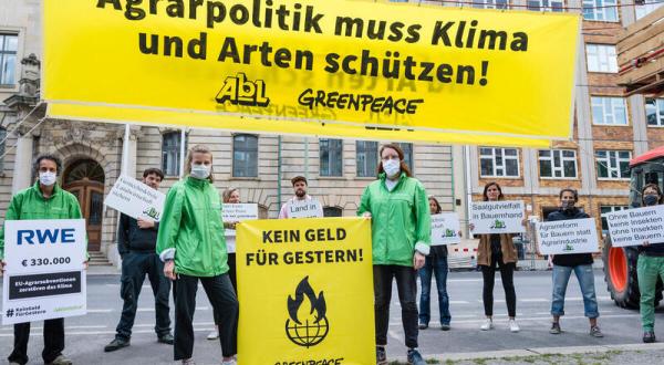 Politisch ist jetzt der Moment, das Ruder herumzureißen: Die EU hat gerade erst ihre neuen Strategien zu Biodiversität und Landwirtschaft veröffentlicht und die Reform der Gemeinsamen Agrarpolitik der EU - kurz GAP - nähert sich der entscheidenden Phase. Heute findet deshalb eine Sonderkonferenz zur künftigen Ausgestaltung der GAP vor dem Hintergrund des europäischen Green Deal statt. Mit dabei sind alle, die die Agrar- und Umweltpolitik maßgeblich bestimmen: Von den Minister*innen für Landwirtschaft und für Umwelt auf Bundes- und Länderebene bis hin zu den beiden EU-Kommissaren für Agrar und Umwelt. Grund genug für Greenpeace und AbL, anlässlich dieses politischen Sondertreffens mit Bannern und Treckern ihren Forderungen nach einer Neuausrichtung der Agrarpolitik an die politisch Verantwortliche zu richten: Bundeslandwirtschaftsministerin Julia Klöckner (CDU).