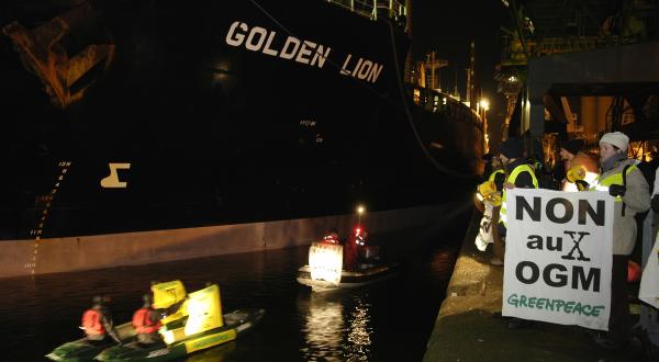 Am frühen Freitagmorgen hat der Frachter Golden Lion mit 32.000 Tonnen argentinischer Gen-Soja an Bord den französischen Hafen Lorient erreicht. Dort erwarteten ihn zahlreiche Greenpeace-Aktivisten. Zusammen mit vielen Mitgliedern der Bauerngewerkschaft Confédération paysanne und der Organisation Faucheurs Volontaires protestierten sie gegen die Ladung des Frachters.