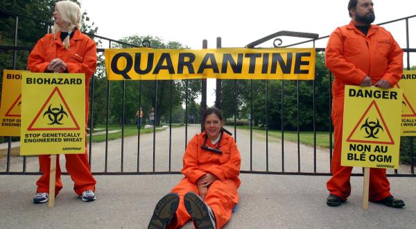 Greenpeace-Aktivisten haben am Mittwoch eine Versuchsfarm für genmanipulierten Weizen in Morden, Kanada, unter Quarantäne gestellt. Vier der Umweltschützer kletterten auf das Dach des Forschungsgebäudes und entfalteten ein 120 Quadratmeter großes Transparent mit der Aufschrift Stop GE Wheat (Stoppt genmanipulierten Weizen). Andere stellten Quarantäne-Signale auf und schlossen sich am Eingangstor fest. Fünf Aktivisten wurden verhaftet, darunter der 29-jährige Jan C. aus Frankfurt am Main, der hoch auf einem Fahnenmast die Biohazard-Flagge gehisst hatte.