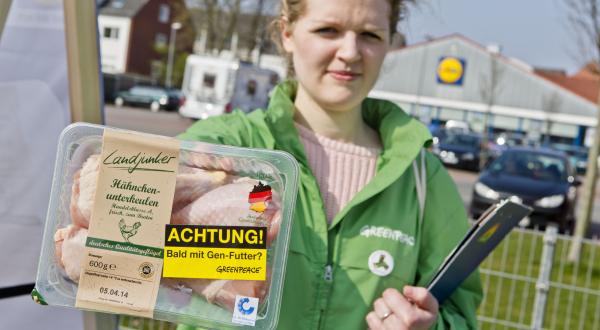 In 35 Städten haben Greenpeace-Aktivisten am Samstag auf den drohenden Einsatz von Gen-Futtermitteln in der Geflügelwirtschaft aufmerksam gemacht. Dazu haben sie in verschiedenen Lidl-Filialen in ganz Deutschland die Geflügelprodukte mit einem Aufkleber versehen: „Achtung! Bald mit Gen-Futter?“ war dort zu lesen. Denn werden die Hühner und Puten mit gentechnisch veränderten Pflanzen gefüttert, landen am Ende Eier und Hühner mit Gen-Soja auf unseren Teller.