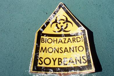 Warnschild: Biologische Gefahr! Monsanto-Soja