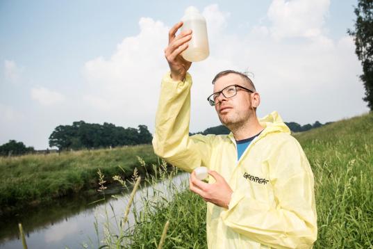 Dirk Zimmermann im Mai 2018 bei der Entnahme von Wasserproben aus dem Fluss Hase im Landkreis Oldenburg. Im Labor werden die Proben auf resistente Bakterien und Spuren von Gülle untersucht.