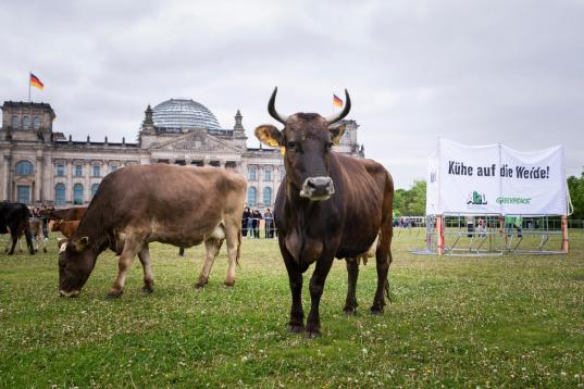 Der Tierhaltung in Deutschland werden aber meist nur die direkten Emissionen zugerechnet und nicht die Treibhausgase, die durch den Anbau von Futterpflanzen etwa in Südamerika entstehen. Eine Greenpeace-Studie hat sich die gesamte Kette angeschaut: So erhöht sich der Anteil der Tierhaltung an den Gesamtemissionen für ganz Deutschland von sechs auf elf Prozent. Die Studie rechnet auch vor, dass die Tierbestände bis 2045 halbiert werden müssen, um die Klimaziele in der Landwirtschaft in Deutschland zu erreichen.