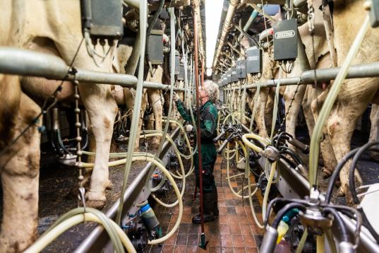 Der Bau von Riesenställen, in denen die Tiere eng an eng stehen, ist getrieben vom Kostendruck durch den harten Preiswettbewerb, der mit einer Industrialisierung der Tierhaltung einhergeht. In Europa verdreifachte sich zwischen 1960 und 2010 die Milch- und Fleischproduktion. Viel und möglichst billig, so die Maxime. Landwirt:innen können diesem Druck oft nicht standhalten. Denn den Preis diktieren die Molkereien und der schwankt sehr. In der Vergangenheit deckte er oft nicht einmal die Produktionskosten der Milchbäuer:innen. Die Zahl der Milchbetriebe ist drastisch gesunken: Im Jahr 1950 gab es noch 1,4 Millionen Höfe, die Kühe hielten, 2024 waren es nur noch 49.452 (Stand Mai). Gleichzeitig werden in den verbliebenen Ställen mehr Kühe gehalten.