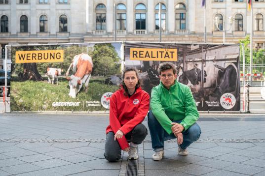 Vor dem Bundesrat demonstrieren Greenpeace und Vier Pfoten am 5. Juli für ein komplettes Verbot der tierschutzwidrigen Anbindehaltung. Die Fotos auf zwei Stellwänden zeigen den Unterschied zwischen idyllischer Werbung und der grausamen Realität in der Rinderhaltung.
