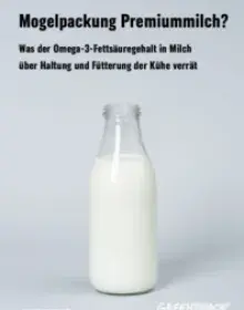 Milch von Kühen, die vorrangig Gras, Heu und Grassilage fressen, enthält mehr Omega-3-Fettsäuren als Milch von Tieren, die vor allem mit Mais und viel Kraftfutter gefüttert wurden. Wie viele dieser gesunden Nährstoffe stecken also in Biomilch im Vergleich zu konventioneller Milch? Greenpeace hat das testen lassen. Soviel vorab: Bei Premiummarken wie Landliebe, Weihenstephan oder Bärenmarke zählt offensichtlich Masse statt Klasse. Die Testergebnisse weisen darauf hin, dass die Tiere vor allem im Stall gehalten und mit viel Kraftfutter gefüttert werden - um möglichst viel Milch zu produzieren.