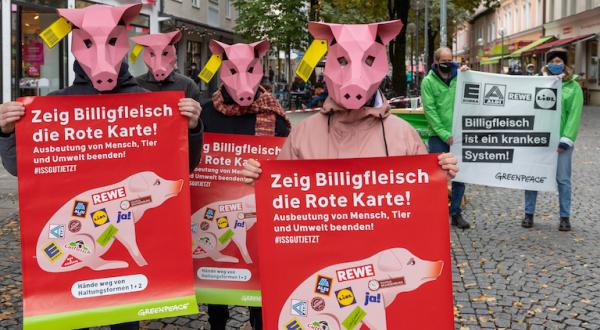 In rund 50 Städten protestieren heute Greenpeace-Aktive gegen Billigfleisch und klären die Kundschaft der Supermärkte über die wahren Kosten der Fleischproduktion auf. (Eine Liste der Orte finden Sie hier.) Mit stilisierten Schweinemasken und Barcode-Clips am Ohr machen sie auf die Ausbeitung von Menschen, Tieren und Umwelt aufmerksam: "Billigfleisch ist ein krankes System" steht auf den Bannern. „Das Konzept der Supermärkte, Fleisch zu Dumpingpreisen anzubieten, um damit Verbraucherinnen und Verbraucher in ihre Läden zu locken, ist Teil des kranken Systems Billigfleisch”, sagt Stephanie Töwe, Landwirtschaftsexpertin von Greenpeace.