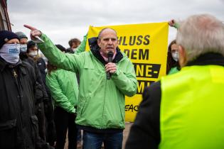Mecklenburg-Vorpommerns Landwirtschaftsminister Till Backhus (rechts) diskutiert am 30.04.2021 in Alt Tellin mit Aktivist:innen, links im Bild Martin Hofstetter, Landwirtschaftsexperte bei Greenpeace.