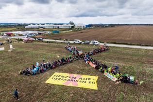 Greenpeace-Aktivist:innen protestieren mit lokalen Initiativen am 28.08.2021 in Alt Tellin gegen den Neuaufbau einer Schweinezuchtanlage.