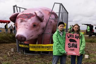 • Überdimensioniertes aufblasbares Schwein in einem Kastenstand, zwei Jugendliche halten Schild "Lass die Sau raus"