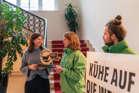 Christiane Huxdorff, Landwirtschaftsexpertin bei Greenpeace, übergibt die Petition "Das Rind muss an die frischen Luft" an das Bundesministerium für Landwirtschaft und Ernährung in Berlin. Staatssekretärin Ophelia Nick (links im Bild) nimmt die rund 65.000 Unterschriften durch einen symbolischen Tischaufsteller "Muht für Veränderung" entgegen.
