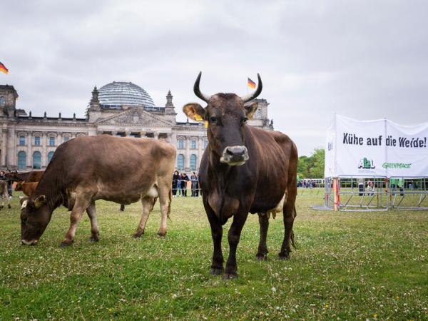 Die Arbeitsgemeinschaft bäuerliche Landwirtschaft (AbL) und Greenpeace trieben Mitte Mai 2023 gemeinsam eine Herde Kühe auf die Wiese vor dem Reichstag. Die Rinder zeigten stellvertretend für ihre 3,8 Millionen Artgenossinnen, dass Milchkühe auf die Weide gehören und der Trend zur ganzjährigen Stallhaltung umgekehrt werden muss. Die Aktivist:innen forderten von Bundeslandwirtschaftsminister Cem Özdemir (Die Grünen), die Weidehaltung deutlich besser zu fördern als bisher.