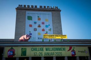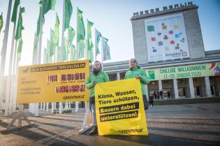 • Schluss mit der Show, Frau Klöckner! Greenpeace-Banner über dem Eingang der Grünen Woche in Berlin