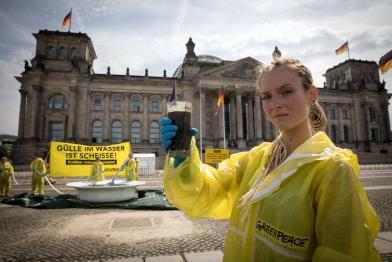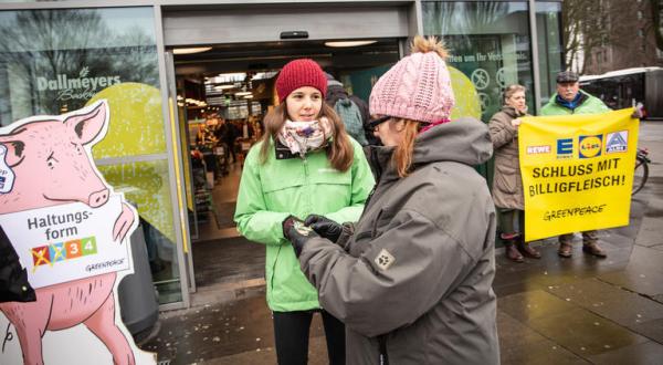 Der Handel trägt also Verantwortung – gegenüber seinen Kundinnen und Kunden, aber auch der Gesellschaft. „Wir wollen den Supermärkten zeigen, dass ihre Billigfleisch-Politik auf Kritik in der eigenen Kundschaft stößt“, erklärt Töwe. Bei einem bundesweiten Aktionstag gegen Billigfleisch werden daher Greenpeace-Freiwillige in 55 Städten aktiv. Mit Informationsmaterial zur Fleischkennzeichnung erklären sie vor Supermärkten, wie man Fleisch aus schlechter Haltung vermeiden kann und informieren über das Ergebnis der Greenpeace-Abfrage. Engagierte Kundinnen und Kunden können sich direkt mit einer Protestpostkarte an die jeweilige Markteitung wenden und eine tier- und umweltfreundlichere Umstellung des Sortiments fordern.