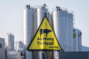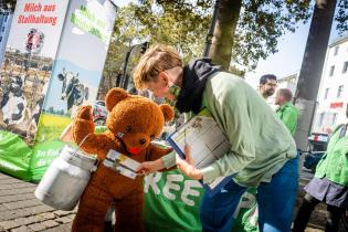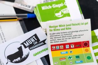 Anfang September protestierten Aktive von Greenpeace in 20 Städten vor Supermärkten für eine artgerechte Haltung von Milchkühen auf der Weide. Mit einer zwei Meter hohen Milchtüte informieren sie über die Folgen der Milchproduktion bekannter Hersteller wie Bärenmarke und Weihenstephan für Kühe, Artenvielfalt und Klima.