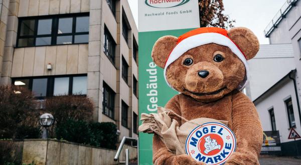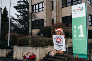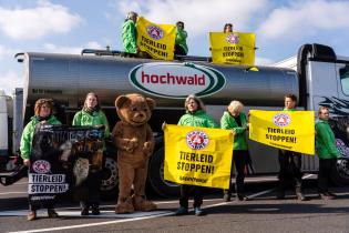 Die Molkerei Hochwald wirbt mit besonders hoher Qualität und verkauft unter dem Label Bärenmarke hochpreisige Milch. Im Molkerei-Ranking landet die Marke jedoch auf dem letzten Platz. Fotos belegen zudem, dass die Milchkühe häufig unter Bedingungen gehalten werden, die gegen das Tierschutzgesetz verstoßen. Aktivist:innen demonstrieren – immer noch dabei: der berühmte Werbeträger der Bärenmarke.