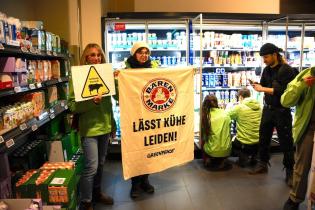Mit einer Werbeparodie hat Greenpeace im Herbst 2023 gezeigt, was wirklich hinter dem Bärenmarke-Idyll steckt. In dem Video sucht der Bärenmarke-Bär auf grünen Wiesen vergeblich nach seinen alten Freunden und muss am Ende feststellen, dass die Kühe ihr kurzes Leben nur noch in Ställen verbringen.