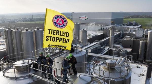 Für mehr Tierwohl und gegen die irreführende Werbung demonstrierten Aktivist:innen wiederholt. So kletterten am 7. März 2024 15 Greenpeace-Aktive auf die Milchsilos des Bärenmarke-Werks in Mechernich, um ein dreieckiges Banner in gelber Warnfarbe anzubringen. Sie blieben mehr als 24 Stunden dort und ließen sich auch von Minusgraden in der Nacht nicht aufhalten. Mehrfach informierten Greenpeace-Ehrenamtliche in zahlreichen Städten an Supermärkten, was hinter der Bärenmarke steckt. Im Interview berichtet Michaela Loch von Aktionen und warum sie sich engagiert.