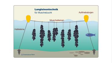 Die Muschelzucht findet im Meer statt. Das Plankton im Wasser dient als Nahrungsgrundlage für die Schalentiere, so dass ein zusätzlicher Eintrag von Nährstoffen nicht nötig ist.