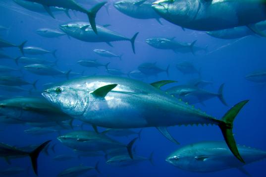Captive bluefin tuna inside a transport cage. The cage is being towed by a tug from fishing grounds in Libya to Tuna farms in Sicily. Greenpeace is calling on the countries of the Mediterranean to protect bluefin tuna with marine reserves in their breeding and feeding areas.