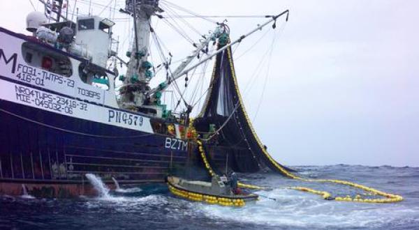 Nachdem die Schwärme mit einer sogenannten Fischlupe, einem speziellen Echolot, aufgespürt sind, wird das dreieckige Netz ausgelegt. Es ist mit Gewichten beschwert, bis zu 2000 Meter lang und bis zu 200 Meter tief. Das Netzende wird durch ein Schnellboot, dass sich vom Mutterschiff entfernt, ringförmig um den Fischschwarm ausgesetzt. Bojen halten die Oberleine an der Wasseroberfläche. Am unteren Ende des Netzes finden sich eingenähte Bleigewichte: Sie halten das Netz im Wasser gestreckt.