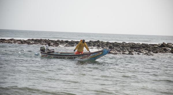 Es ist früher Nachmittag in seinem Fischerdorf Ouakam. Der Ozean ist aufgewühlt an diesem Oktobertag, das Wasser peitscht auf den Strand. Einige Boote sind trotz der starken Strömung draußen auf dem Meer, andere liegen am Ufer. Die Fischer stehen beisammen, warten darauf auszulaufen oder sind gerade vom Fischen zurück. Mamadou Sarr ist einer von ihnen.