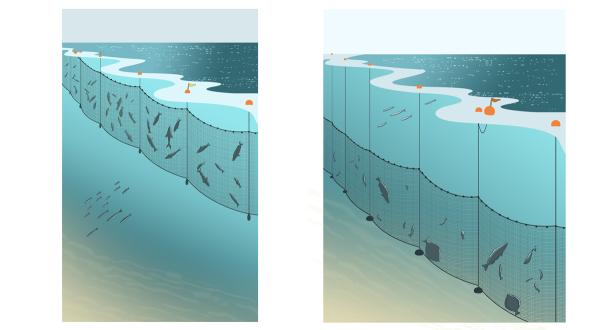 Bei Stellnetzen unterscheidet man Grundstellnetze und pelagische Stellnetze. Beide sind bis zu 15 Meter hoch und bis zu 15 Kilometer lang. Das Grundstellnetz ist mit Gewichten fest im Boden verankert, während das pelagische Netz frei im Wasser hängt. An der oberen Netzkante sind sie mit Bojen versehen. Die Netzenden werden mit Ankern gesichert.