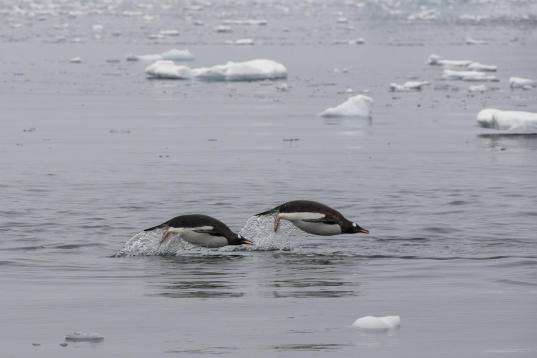 Schwimmende Eselspinguine im Errera-Kanal in der Antarktis