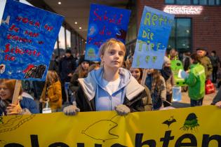 Mit Musik und Gesang geht es eine Stunde lang weiter durch die HafenCity. Durch die Straßen schallen auch die Protestsongs, die von den Greenteamerinnen Jojo und Leni auf bekannte Laternenlieder umgetextet wurden. Über die Ausläufer der Speicherstadt wandert der Zug langsam zurück und landet gegen kurz nach 18 Uhr an der Osaka-Alle.