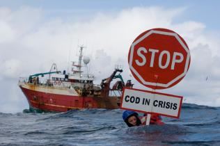• Greenpeace-Aktive tauchen am Fangschiff "Endurance", um Kabeljau zu schützen