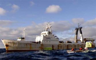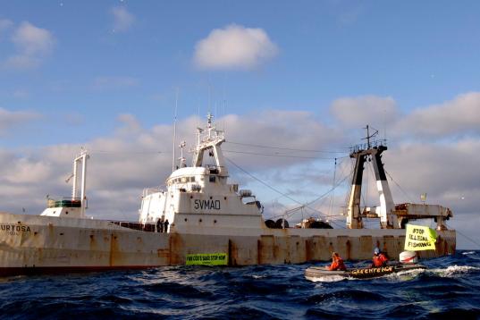 Greenpeace activists in an inflatable boat take direct action in an effort to interrupt the destructive fishing activities of the Togo-flagged, factory trawler 'Murtosa' in the international section of the Barents Sea known as the loophole, a pocket of high seas positioned between exclusive economic zones. Campaigners on board the Greenpeace ship, Esperanza, confirmed with the trawler's captain that he was knowingly taking the cod with no legal quota and was conducting so-called IUU (Illegal, Unregistered, Unreported) fishing, also known as Pirate Fishing.
