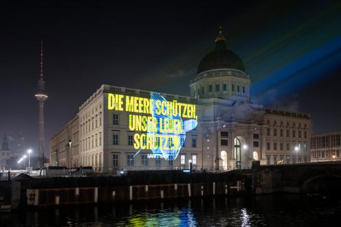 Greenpeace-Aktive projizieren Bilder von Meereslebewesen und Botschaften über die Bedeutung der Meere und die Dringlichkeit ihres Schutzes auf die Fassade des Berliner Humboldt-Forums. Sie adressieren damit speziell Bundesumweltministerin Lemke (Bündnis 90/Die Grünen), die sich für den überfälligen Abschluss eines starken Schutzabkommens für die Hohe See einsetzen soll.