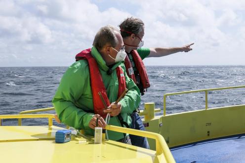 Manfred Santen (vorne) und Greenpeace-Pressesprecher Björn Jettka bei Probenahmen in der Nordsee, 29. Juli 2023.