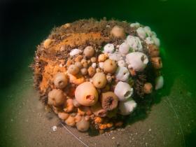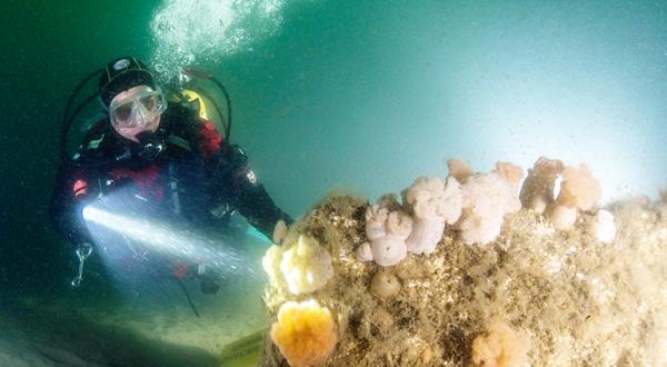 September 2015: Greenpeace-Taucher dokumentieren den Bewuchs auf den 2008 versenkten Felsen.