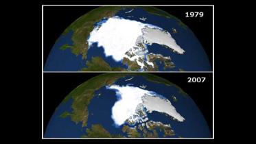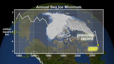 2008 schritt die Klimaerwärmung in der Arktis erstmals fast doppelt so schnell voran wie im globalen Durchschnitt. Zwei Grad Celsius mehr misst man dort, während es im globalen Mittel 0,57 Grad sind. Die fatalen Folgen: Das Eis schmilzt viel schneller als selbst in den konservativsten Klimaszenarien erwartet wurde. Jahresvergleiche des Sommereis-Minimums machen die Dramatik deutlich.