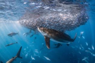 • Eine große Anzahl von Riffhaien, Fischen und Vögeln an einem Köderball, Korallenriff, Australien