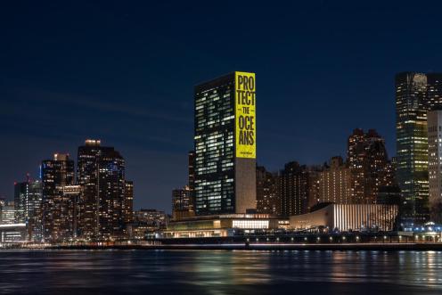 "Protect the Oceans"-Projektion auf das UN-Hauptgebäude in New York im März 2023