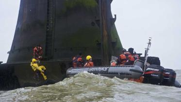 Gegen die Blockadehaltung des Hamburger Senats protestieren Greenpeace-Aktivist: innen am 29. Januar am Leuchtturm Roter Sand in der Außenweser – zwei Tage vor Ablauf der Frist: Bis zum 1. Februar muss der Welterbe-Antrag mit den Unterschriften aller Beteiligten bei der UNESCO in Paris vorliegen. Frischer Wind und unruhige See hätten die Aktion fast verhindert. Doch am Nachmittag hängt das Banner mit der Greenpeace-Botschaft: "Tu Watt, Ole – JA zum Weltnaturerbe Wattenmeer."