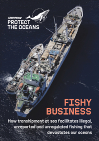 Fischfang aus illegaler, unkontrollierter und unregulierter Fischerei (IUU) macht nach Schätzungen der Welternährungsorganisation FAO rund ein Fünftel der gesamten Handelsmenge auf den internationalen Märkten aus – mit einem Marktwert von bis zu 23 Milliarden US-Dollar. Wie das Transshipment, das Umladen von Fisch vom Fang- auf ein riesiges Kühlschiff weit draußen auf See, dabei hilft, enthüllt der aktuelle Greenpeace-Report "Fishy Business". Gestützt auf Daten der Organisation „Global Fishing Watch“ und zahlreiche weitere Quellen haben Greenpeace-Rechercheure 416 international operierende Kühlschiffe identifiziert und beobachtet: Sogenannte „Reefer“ betreiben das zerstörerische Geschäft mit Fisch auf der Hohen See. Die globale Flotte verbirgt sich hinter komplexen Eigentümerstrukturen.
