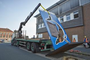 Vor der Firmenzentrale der Fischmanufaktur haben 15 Greenpeace-Aktivisten eine riesige stählerne Walskulptur aufgebaut, welche das Unternehmen mahnen soll, ein Zeichen für den Walschutz zu setzen. „Save The Whales“ (Schützt die Wale) steht auf dem vier Meter hohen und 2,5 Meter breiten Kunstwerk. Ganze 8,7 Tonne wiegt diese gigantische Skulptur.