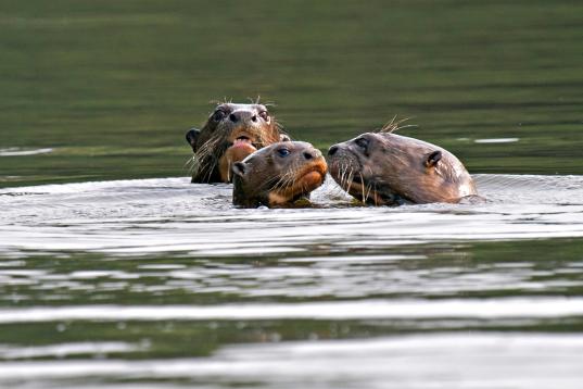 Der Riesenotter lebt entlang der großen südamerikanischen Flusssysteme. Er ist die größte aller Otterarten und kann bis zu 180 cm lang werden. Dank seines kräftigen Schwanzes, seines wendigen Körpers und seiner Schwimmhäute ist der Riesenotter ein fantastischer Schwimmer, der an einem Tag zwischen 2,5 und 4 Kilo Fisch fängt. Neben Fischen mag der Riesenotter auch Schalentiere, Schlangen und andere Tiere, die in den Flüssen leben. Riesenotter leben in Familien; und Otterpaare bleiben ein Leben lang zusammen. Das dicke, wasserdichte Fell des Riesenotters ist aber leider sehr begehrt und die Art ist aufgrund der Bejagung vom Aussterben bedroht.