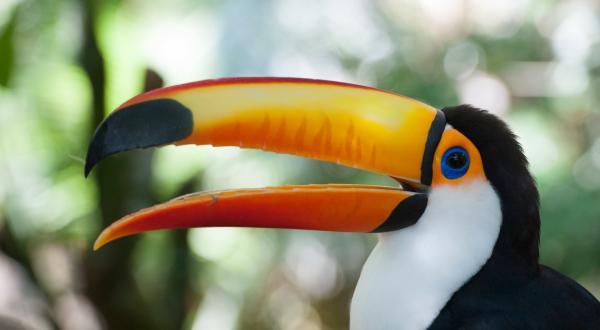 Der Amazonas-Regenwald beherbergt dutzende Arten aus der Familie der Tukane, und der Riesentukan ist vielleicht das bekannteste Tier der Region. Tukane sind Verwandte der Spechte. Der Riesentukan ist der größte unter den Tukanen und misst vom Schnabel bis zur Schwanzspitze 55 bis 65 cm. Er hält den Rekord für den größten Schnabel im Verhältnis zur Körpergröße - seine kräftigen und bunten Schnäbel können bis zu 23 cm lang sein! Die Schnäbel sind effektive Werkzeuge für Tukane, um ihre Lieblingsnahrung, Früchte, zu pflücken, aber sie fressen auch Samen, Insekten, kleine Reptilien, Eier und frisch geschlüpfte Küken anderer Vögel.